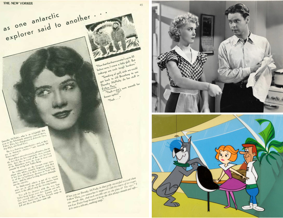 THE MANY FACES OF PENNY SINGLETON…At left, before she was the film star Penny Singleton,Dorothy McNulty was a popular star on Broadway, as this ad from the Nov. 9 New Yorker attests. At top, Singleton with Blondie co-star Arthur Lake in the first installment of that popular 27-film series, 1938; a still from The Jetsons 1962-63, for which Singleton provided the voice of Jane Jetson. (IMDB/Hanna-Barbera)