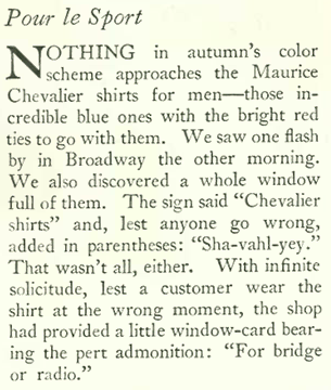 …and further on in “The Talk of the Town,” White shared these observations regarding the popularity of shirts worn by French actor Maurice Chevalier…
