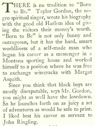 The book review featured an autobiography, Born to Be, written by Taylor Gordon (1893-1971), a famed singer of the Harlem Renaissance, that traced his life journey from Montana to New York. The book included ten full-page illustrations by Mexican artist Miguel Covarrubias, and forwards by Carl Van Vechten and Muriel Draper.