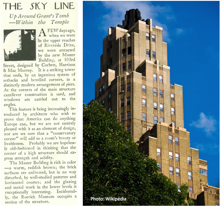 Architecture critic George Chappell gazed upward in admiration for the new Master Building on Riverside Drive. It was one of the city’s first mixed-use structures and the first New York skyscraper to feature corner windows. The apartment building originally housed a museum, a school of the fine and performing arts, and an international art center on its first three floors. The building fell into decline in the late 1960s, but today it thrives as a housing co-operative. The Master was listed on the National Register of Historic Places in 2016.