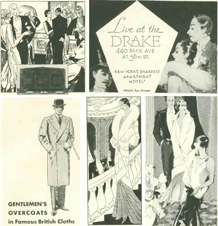 Clockwise, top left, a sampling of illustrations from ads in the Oct. 26 issue: there seemed to be no item too mundane for the posh treatment—an illustration that graced an ad from Frigidaire; superior airs displayed on behalf of the Drake apartments, and below, also on behalf of (sniff) Gotham Gold Stripe stockings; “Arabella” surveys two of her hapless conquests as she descends the stair in an illustration for a Marie Earle salon ad; and an appeal to the city’s rampant Anglophilia from De Pinna of Fifth Avenue.