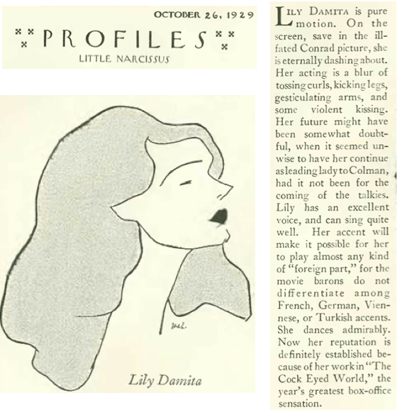 Although today she is known mostly as Errol Flynn’s first wife, the tempestuous French actress Lily Damita (1904-1994) knew how to light up New York and get noticed in Hollywood when she made her American debut in 1929. Henry F. Pringle looked in on Damita’s daily life in the Oct. 26 “Profile.” A brief excerpt:
