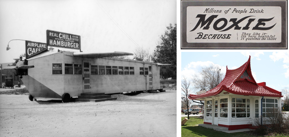 MADE YOU LOOK…Examples of roadside vernacular architecture from the 1920s included the Airplane Cafe in in the San Fernando Valley (1924) and a 1927 Wadham’s gas station in West Allis, Illinois, now on the U.S. National Register of Historic Places. More than 100 of Wadham’s “pagodas” were built, but like much of roadside America, few examples remain. At top, right, a 1920s billboard advertising Moxie soft drinks. (last1onthebus.com/Pinterest/Wikipedia)THE DUCK STOPS HERE…The Big Duck in Flanders, New York, was built in 1930-31 by Long Island duck farmer Martin Maurer to sell duck and duck eggs to passing motorists. It was listed on the National Register of Historic Places in 2008. (Google Maps)