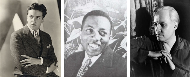 COMBINED TALENTS come together in Taylor Gordon’sBorn to Be: Mexican painter, caricaturist, and illustrator Miguel Covarrubias (left, in a 1920s photo by Nickolas Muray) and Harlem Renaissance singer Gordon (center, in a photo by Carl Van Vechten, who is pictured in a self-portrait at right). (Pinterest/minormoderns.blogspot.com/Wikipedia)
