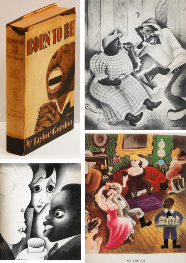 FROM MONTANA TO HARLEM…First edition of Taylor Gordon’sBorn to Be, and illustrations from the book by Miguel Covarrubias (including cover image). The image at bottom left features patron of the Harlem Renaissance Carl Van Vechten, with Gordon. (qbbooks.com/klinebooks.com/Pinterest)