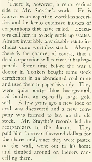 Coates told the story of a Yonkers doctor who used what he thought were worthless stock certificates (from an abandoned coal mine) to paper the walls of his study. Thanks to Smythe’s meticulous record-keeping, when a new lode was discovered at the mine, the doctor learned his wallpaper was worth $14,000 (equivalent to about $200,000 today)…