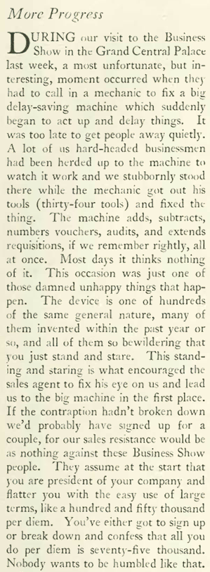 Ironically, the National Business Show was staging a big exhibition in Midtown while the economy was collapsing Downtown. James Thurber was on hand at the Grand Central Palace to take in the wonders of the machine age…