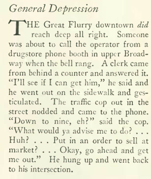 In “The Talk of Town” we find the first use of the word “Depression” in The New Yorker as it is related to the economic collapse…