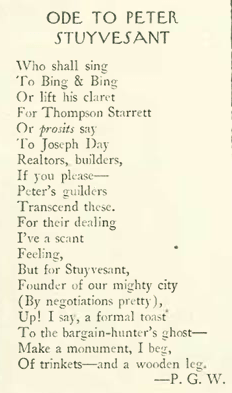 …thankfully, an alert reader kindly pointed out that “Ode to Peter Stuyvesant” isn’t by Wodehouse, but by another person with the initials P.G.W. — Philip G. Wylie.