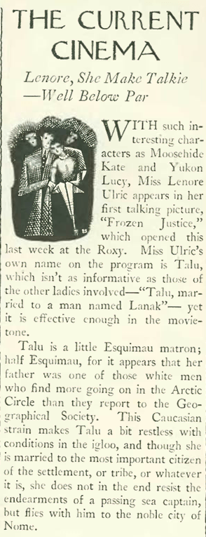 Back stateside, New Yorker film critic John Mosher took in the talking film debut of the hugely popular stage actress Lenore Ulric (1892-1970). Known on Broadway for her portrayals of fiery women, she tried, it seems unsuccessfully, to bring some of that heat to Frozen Justice, which was set in Alaska during the Klondike Gold Rush…