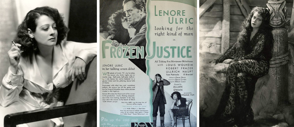FEMME FATALE…Lenora Ulric, who made less than 20 films, was known for her work on the stage. At left, Ulric taking a break from her Broadway work in the early 1930s; center, magazine ad for Frozen Justice; at right, Ulric as the half-Eskimo Talu in Frozen Justice. (Pinterest/IMDB)
