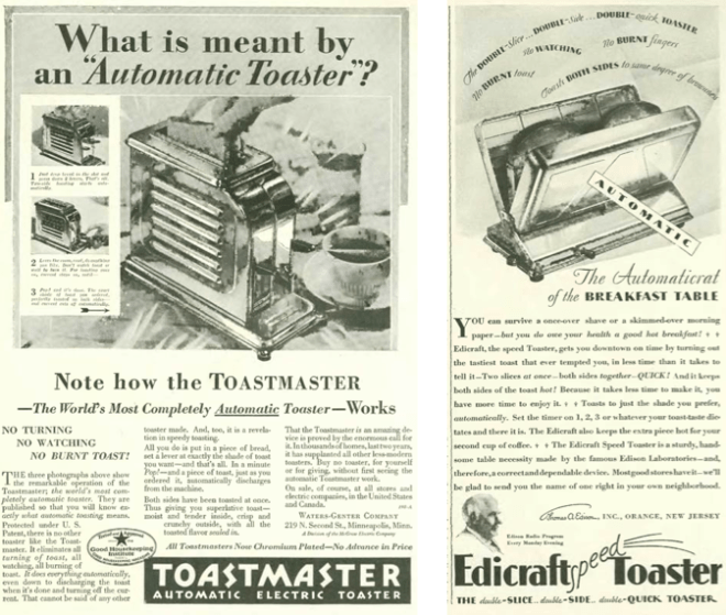 We begin with the back pages, where toaster wars were being waged by the makers of the “Toastmaster” and Thomas Edison’s “Automaticrat”…