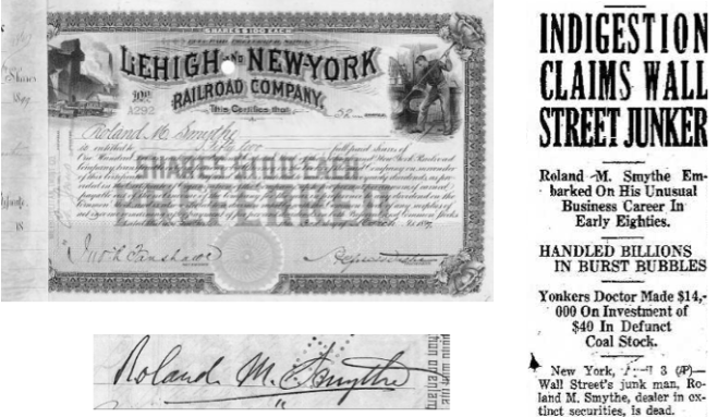WALL STREET JUNKER…Share bought by Roland M. Smythe in 1899 and signed by him on the reverse side. At right, unusual obituary headline for an unusual man. (scripophily.org)