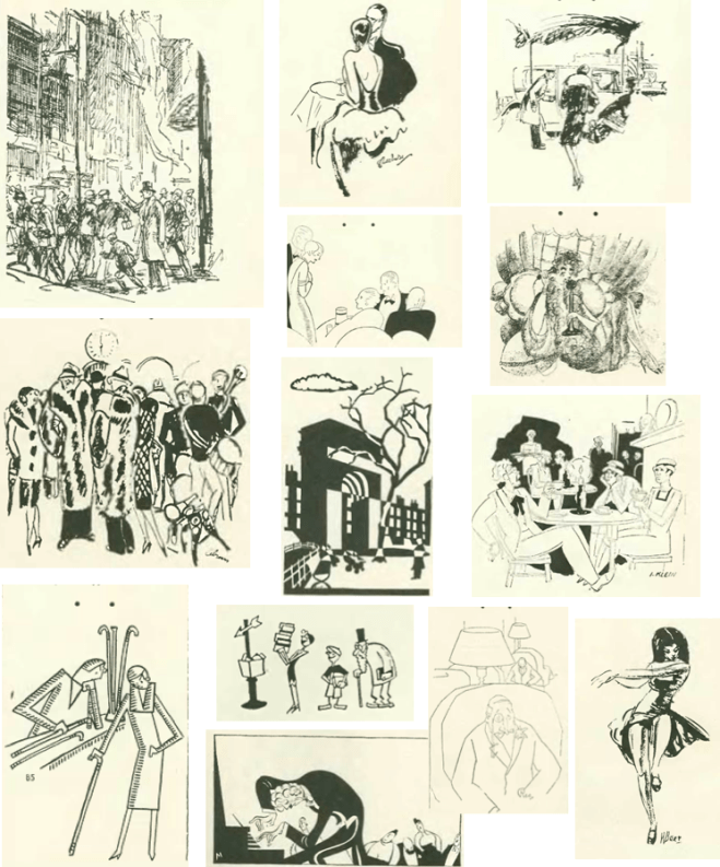 …on to our illustrators and cartoonists…spot drawings — sprinkled throughout the magazine — were often a foot in the door for aspiring contributors (Peter Arno and Charles Addams are just two examples). Below is a collection of spot drawings from the Nov. 2 issue, mostly from established artists including Barbara Shermund, Alice Harvey, Julian De Miskey, Gardner Rea, Johan Bull and I. Klein. The New Yorker also recycled old cartoons for spots, including the illustration below (third row, second one down) by Shermund of the young woman on telephone, which originally appeared in the July 16, 1927 issue with the caption, “Hold the line a minute, dear—I’m trying to think what I have on my mind.”