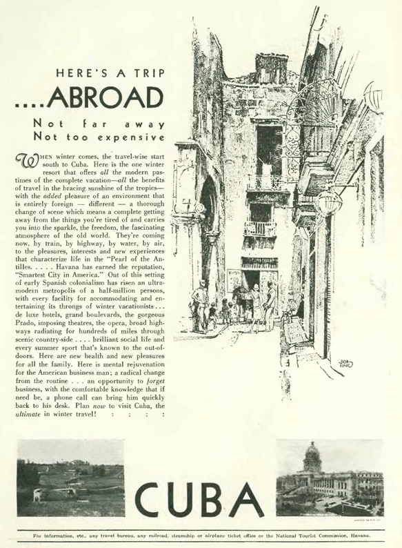 Already at this early date advertisers were responding to tightening belts — this appeal from the Cuban Tourism Commission offered “an opportunity to forget business” while traveling on the cheap…