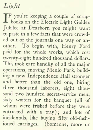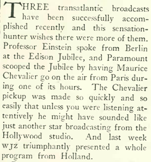 The New Yorker also noted the successful transmission of three transatlantic broadcasts, including remarks spoken by Albert Einstein from Berlin to the Electric Light Golden Jubilee in Dearborn, Michigan: