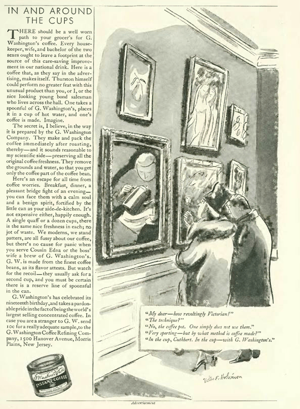 …we’ve seen ads illustrated by other New Yorker cartoonists including Peter Arno, Rea Irvin, and Julian De Miskey;Helen Hokinson got in on the action with this ad touting G. Washington instant coffee…the first instant coffee to be produced on a mass scale, G. Washington was so well known it was referred to as a “cup of George.” The brand was discontinued in 1961…