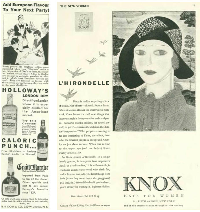 …on to other ads, the one on the left is another sad example of how manufacturers of spirits tried to market non-alcoholic versions of their libations to Prohibition-starved Americans (“especially distilled for the American market”)…at right, an ad from Knox hatters, with a somber rendering of a young woman (maybe she’s headed to the party in the other ad) wearing a fashion that would be popular in the early Thirties…the old flapper hat, along with the Jazz Age, was dead as a doornail…
