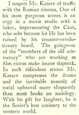 This brief “Talk” entry by Alfred Richman related a story from a traveling salesman just returned from Moscow. Among the highlights of his visit was a Soviet movie that “featured” America’s Sweetheart, Mary Pickford, in the title role…