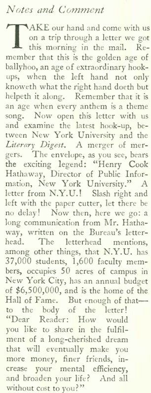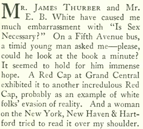 This caused such a stir that The New Yorker dedicated the entire first page of “The Talk of the Town” to a satirical commentary furnished by E.B. White. An excerpt: