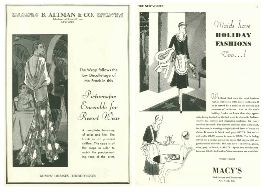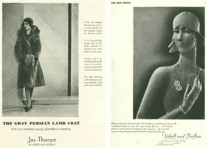 Now that we are post-market crash, we will be seeing the effects of that crash on New Yorker advertisers. Here are three advertisers from the Nov. 9 issue not long for the world: from left, the high-fashion salon Stewart & Company would file for bankruptcy and go out of business by the spring of 1930; Pierce-Arrow, maker of rolling status symbols for the wealthy, ceased car production in 1933; Hanan & Son, a leader in the mass production of shoes, would go bankrupt and fold by 1935.