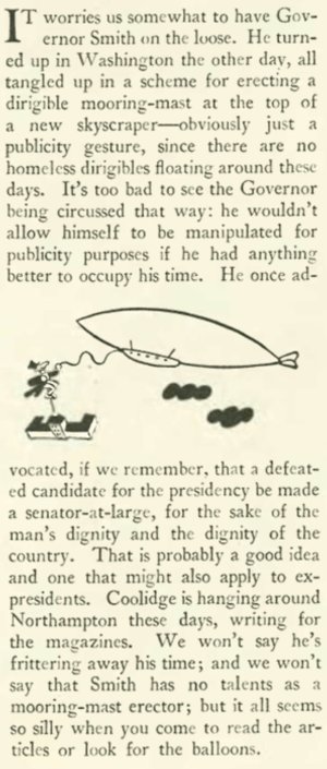 In “The Talk of the Town,” White also looked to the new year, which would see AlSmith’s Empire State Building rise into the air and forevermore define the city’s skyline, even if his dirigible mooring mast proved to be more of a marketing stunt than a working feature of the new skyscraper: