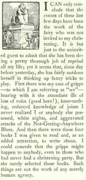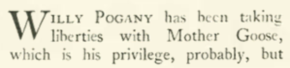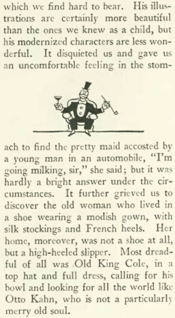 “Talk” (via E.B. White) took another shot at illustrator WillyPogany, who had recently updated the drawings in AliceinWonderland, transforming little Alice into a tween flapper. This time Pogany was “taking liberties” with dear old Mother Goose: