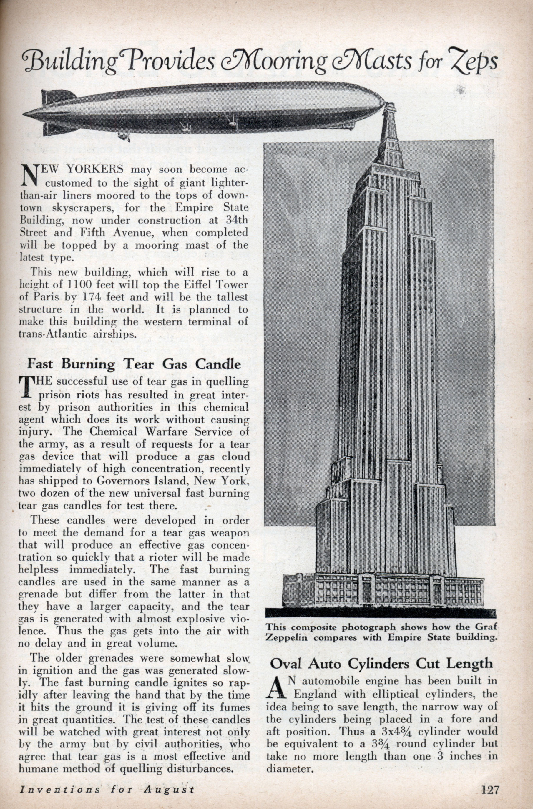 A LOT OF HOT AIR…Image from the August 1930 issue of ModernMechanix. The idea of transatlantic dirigibles ferrying passengers to skyscrapers seemed plausible in 1930, but in reality giant bags of flammable hydrogen, attached to wind-whipped masts above densely populated areas, proved impractical, if not downright insane. (Modern Mechanix)