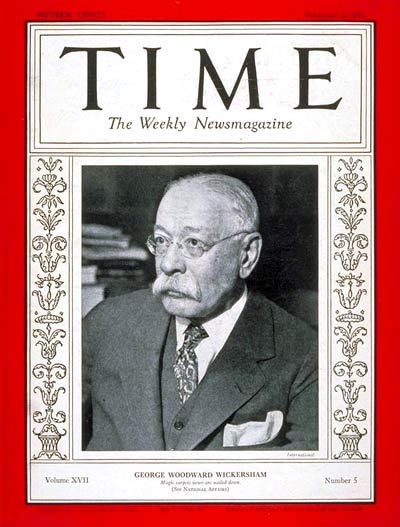 SOBER UNDERTAKING…George Wickersham was featured on Time’s Feb. 2, 1931 cover for his leadership on the National Commission on Law Observance and Enforcement, better known as the Wickersham Commission. (Time Inc.)