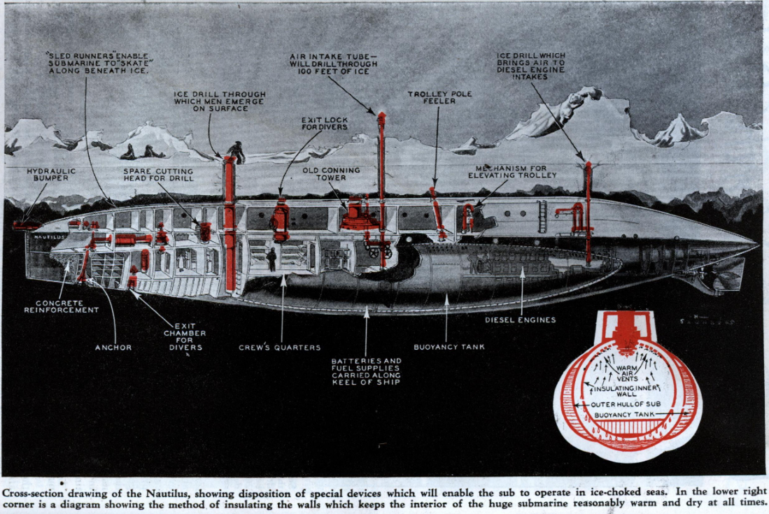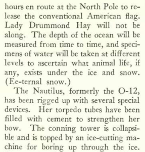 On to happier news, “The Talk of the Town” looked in on preparations for a North Pole trip by a refitted and renamed military submarine, Nautilus. An excerpt: