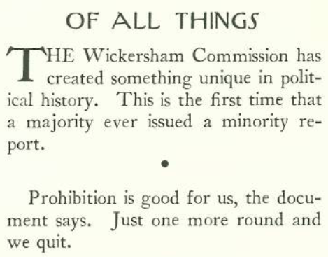 Back to The New Yorker,Howard Brubaker weighed in with his column, “Of All Things,” correctly noting that the majority of Americans wanted an end to Prohibition laws despite the Commission’s recommendations…