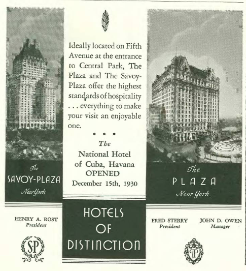 We have two of New York’s finest hotels advertised along with the newly opened National Hotel in Havana, Cuba. All three were under the same management at the time. The Cuban hotel would be heavily damaged two years later in a coup led by Fulgencio Batista. It would be restored, and eventually nationalized by Fidel Castro. The Savoy-Plaza would not be so lucky, demolished in 1965 to make way for the General Motors Building…