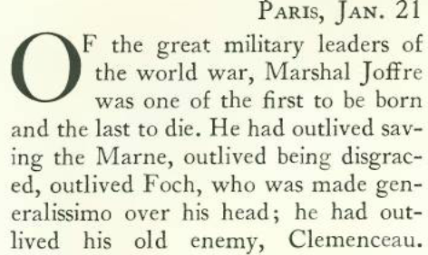Paris correspondent Janet Flanner noted the passing of 78-year-old French Field Marshal Joseph Joffre, the last of the great World War I military leaders. Note that Flanner referred to Joffre’s war as “the world war,” since the next world war was still on the horizon.