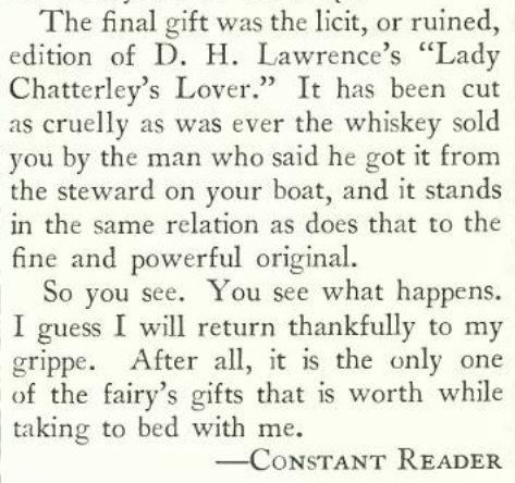Laid up with the flu, Dorothy Parker turned to some reading during her convalescence, only to find that the books provided to her (for review) were far from uplifting. One in particular, a censored version of D.H. Lawrence’sLady Chatterley’s Lover, was downright galling. Excerpts: