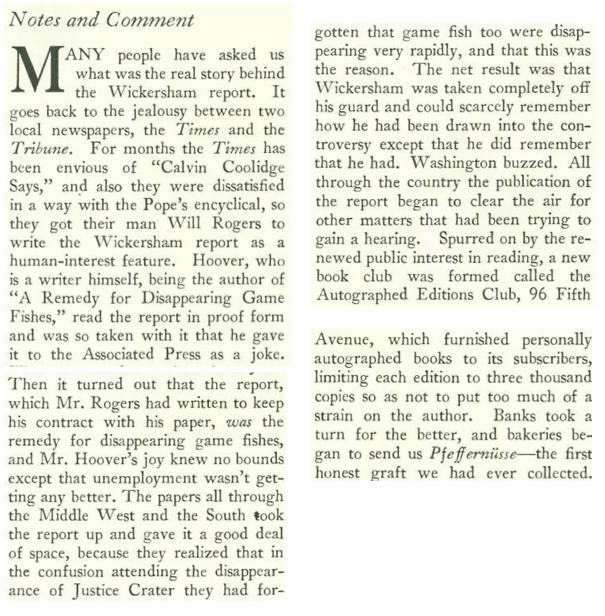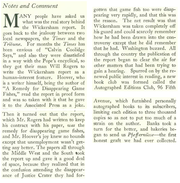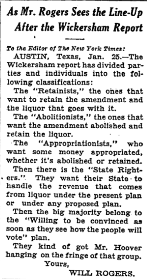 Humorist Will Rogers also commented on the report in this letter published on page 19 of the Jan. 26, 1931 edition of The New York Times…