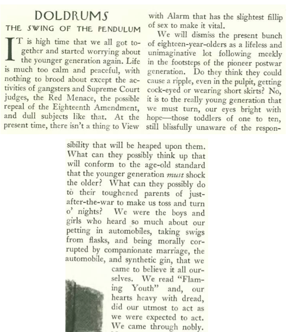 Lois Long was only 29 years old when she wrote her “Doldrums” series for The New Yorker, but the chronicler of Jazz Age nightlife who once epitomized the flapper lifestyle felt much older given how much the world had changed in just a few short years. She was particularly appalled by the younger generation’s embrace of “health and vitality” over her own generation’s lust for the party life…