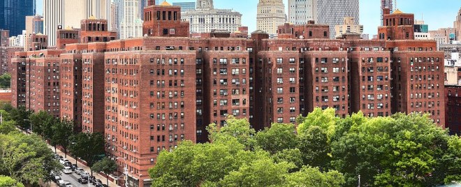 BREATHING ROOMS…Knickerbocker Village in 2019. To make way for the development, one hundred buildings were razed in the “Lung Block,” so named because of its high tuberculosis mortality rate. The development continues to be designated as affordable housing. (Wikipedia)
