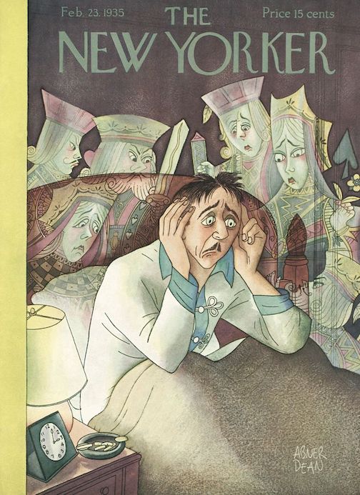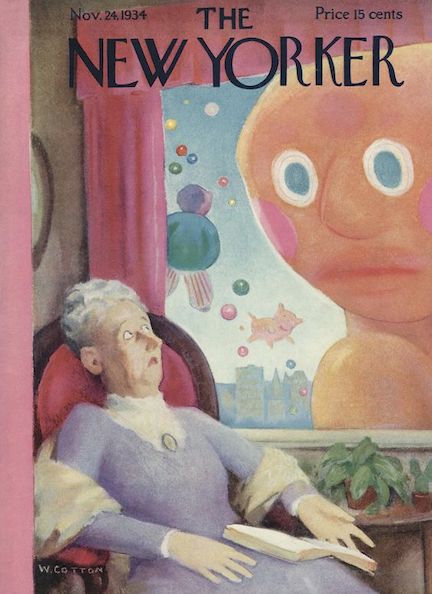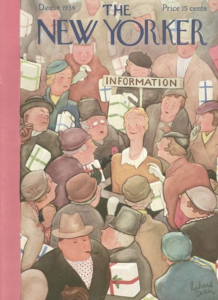 November 23, 1935 cover by Antonio Petruccelli. Petruccelli (1907-1994) began his career as a textile designer, becoming a freelance illustrator in 1932 after winning several House Beautiful cover contests. This is one of four covers he produced for The New Yorker.Antonio Petruccelli. Here are samples of Petruccelli’s remarkable work.(Helicline Fine Art)
