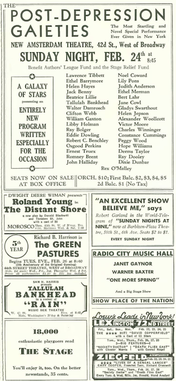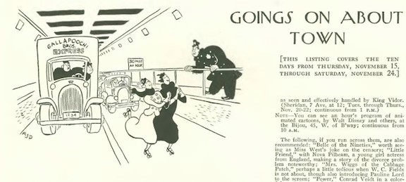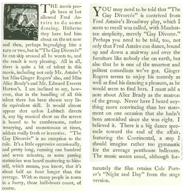 …and dance remains a theme with John Mosher’s film review of the Fred Astaire and Ginger Roger musical The Gay Divorcee, which was based on the 1932 Broadway musical Gay Divorce starring Astaire and Claire Luce.
