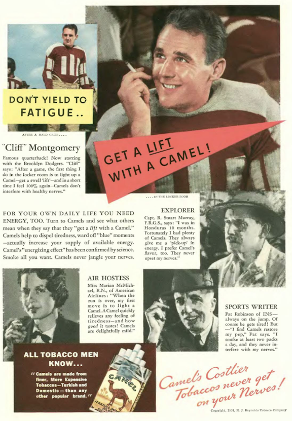 Just one ad from the Nov. 17 issue (more to come below)…the latest athlete to attest to the energizing effects of Camel cigarettes…Cliff Montgomery (1910–2005) was famed for a hidden ball trick play that led one of the greatest athletic upsets—Columbia’s 7-0 win over Stanford in the 1934 Rose Bowl. Montgomery would play one year with the NFL Brooklyn Dodgers, and would later earn a Silver Star for his heroism during World War II…
