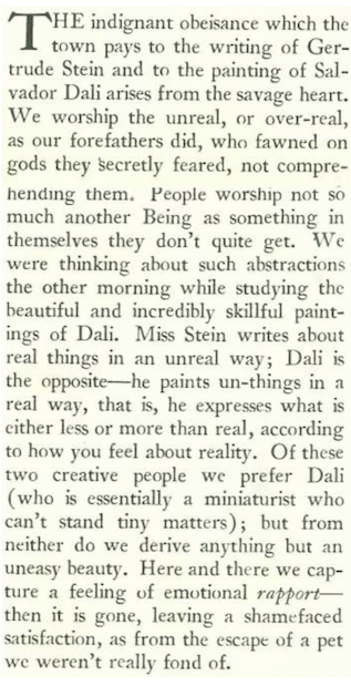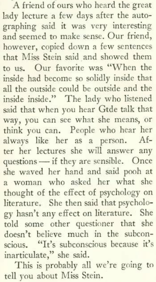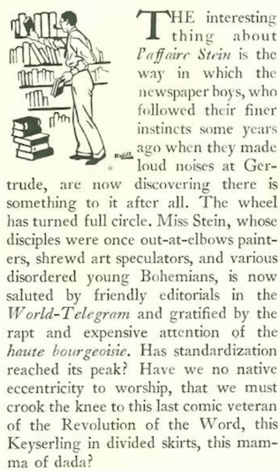 …where we find still more scorn being heaped upon Gertrude Stein. “The Talk of the Town” offered this observation (excerpt):