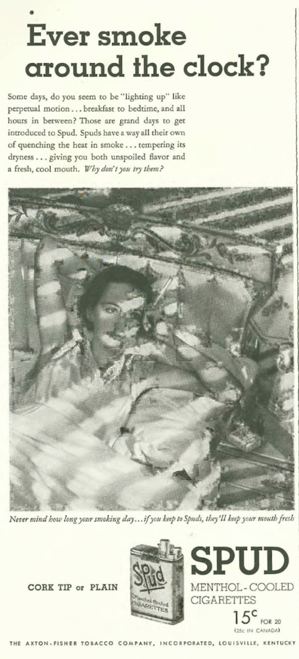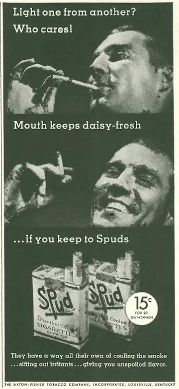 …the makers of Spud menthol cigarettes continued their campaign to encourage chain-smoking with this rather depressing image…