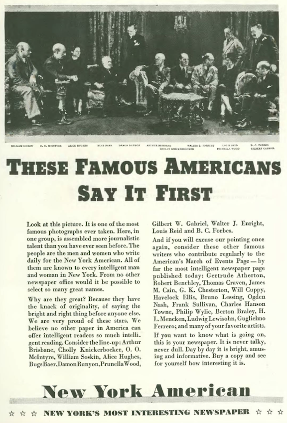 …the New York American was a Hearst broadsheet known for its sensationalism, however it did claim Damon Runyon, Alice Hughes, Robert Benchley and Frank Sullivan among its contributors…the morning American merged with the New York Evening Journal to form the American and Evening Journal in 1937. That paper folded in 1966…