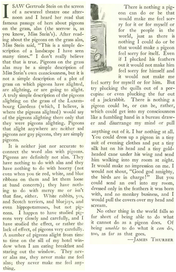 Here is a YouTube clip of the newsreel satirized by Thurber. Stein begins her “pigeon” reading at the 30-second mark: