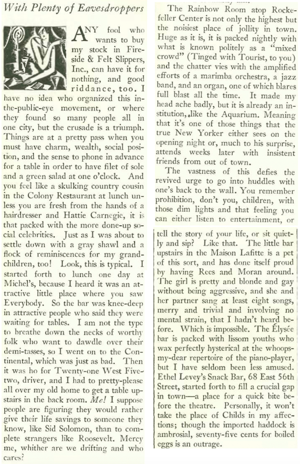 Lois Long was back with another installment of “Tables for Two” and in these excerpts she found the Central Park Casino a welcome place to hang out, apparently unaware that Parks Commissioner Robert Moses had already served an eviction notice to the Casino’s owners (Moses would tear down the Casino in 1936, mostly to settle a personal vendetta). Long also found respite at the Place Piquale, which featured the musical stylings of Eve Symington.