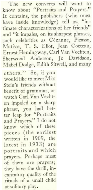 Fadiman continued by excoriating Stein’s latest book, Portraits and Prayers, likening its “shrill, incantatory” quality to “the rituals of a small child at solitary play.”