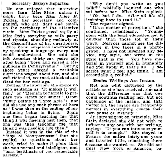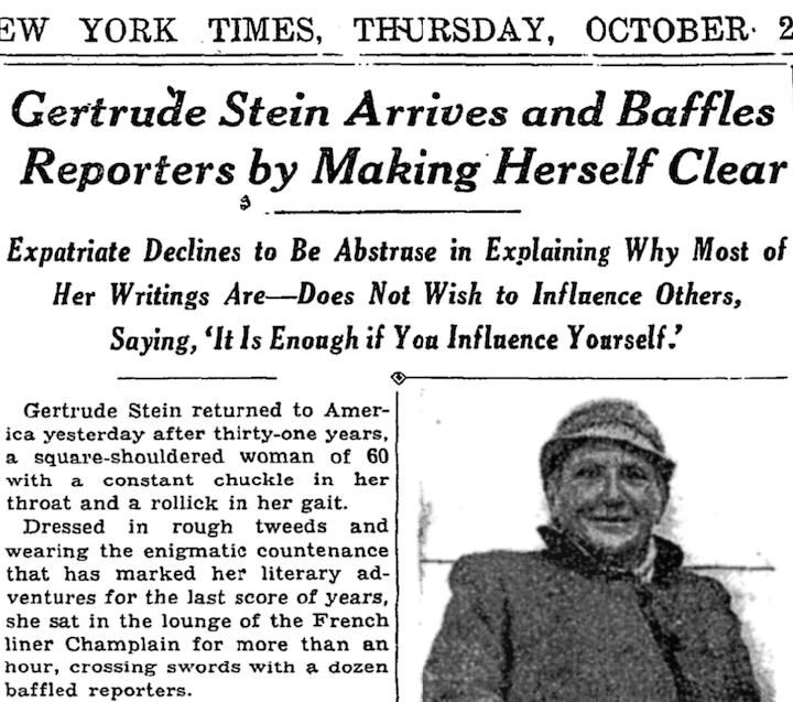Writing for the Smithsonian Magazine (October 2011), Senior Editor Megan Gambino notes that publishing houses regarded Stein’s writing style as incomprehensible (Gambino writes that shortly after her arrival in the U.S., “psychiatrists speculated that Stein suffered from palilalia, a speech disorder that causes patients to stutter over words or phrases”), but in 1933 “she at last achieved the mass appeal she desired when she used a clearer, more direct voice” in The Autobiography of Alice B. Toklas. However, Stein was still best known in the U.S. for her “insane” writings, as one New York Times reporter described Stein’s work upon the writer’s arrival in New York. Excerpts from the Oct. 25, 1934 edition of the Times: