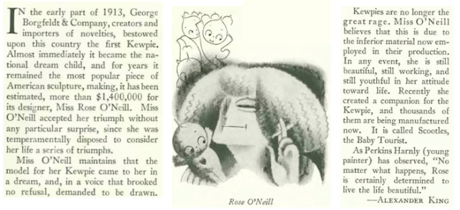 Raised in rural Nebraska, at an early age Rose O’Neill (1874–1944) demonstrated an artistic bent, and was already a published illustrator and writer when she drew her first images of “Kewpie” around the year 1908. A German doll manufacturer began producing a doll version of Kewpie in 1913, and they became an immediate hit, making O’Neill a millionaire and for a time the highest-paid female illustrator in the world. When Alexander King penned a profile of O’Neill, Kewpies were no longer the rage, but O’Neill was nevertheless determined to find success in a new doll line. Excerpts: