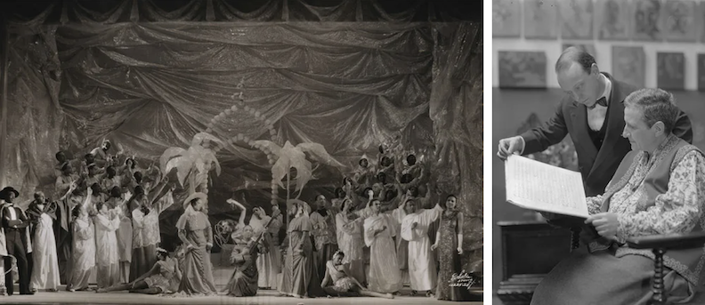 SAINTS AND PIGEONS…The original cast of Four Saints in Three Acts, onstage at the Wadsworth Atheneum, Hartford, 1934; at right, Gertrude Stein reviews the libretto for Four Saints with American composer Virgil Thomson, 1934. (Harold Swahn/Bancroft Library, UC Berkeley)