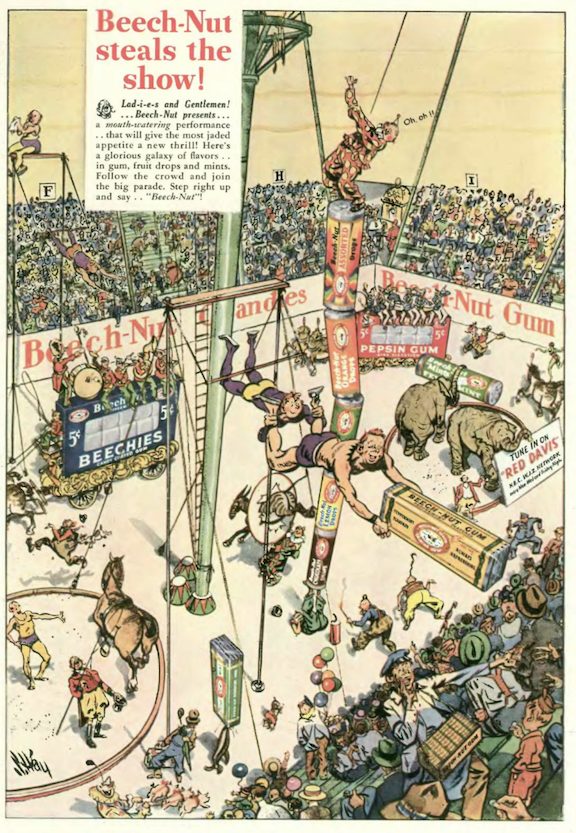 …illustrator Stuart Hay drew up this full page ad for the makers of Beech-Nut candy and chewing gum…when I was a kid we used to call this “grandpa gum”…